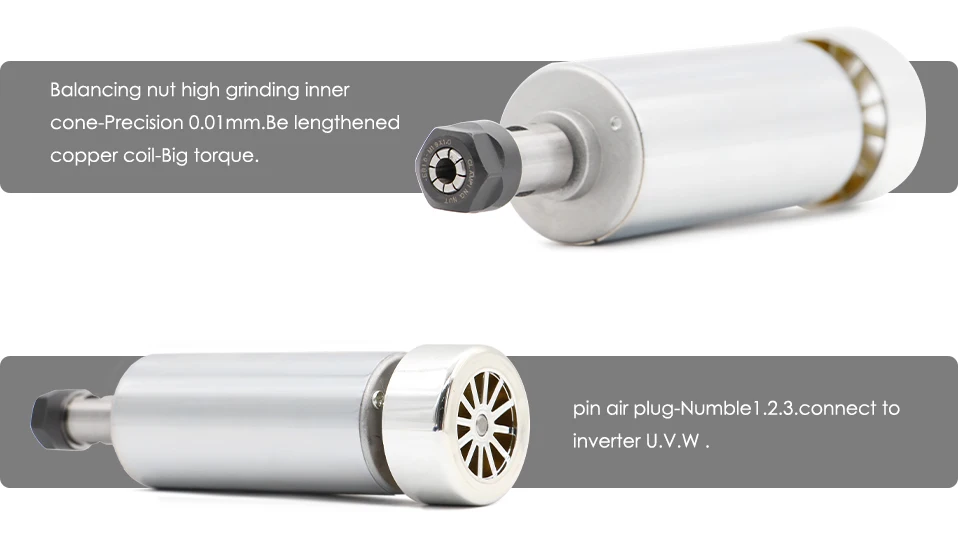 * Motor has modified the standard milling chucks ER16-A, Standard 8mm collet and nuts, run out around 0.02-0.05.